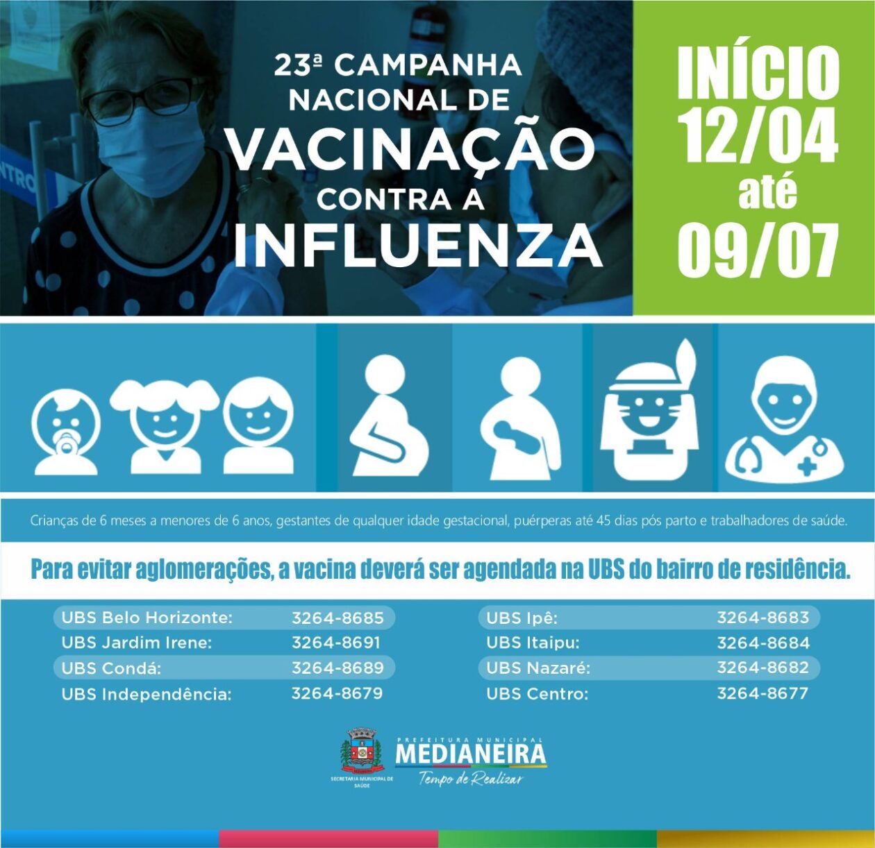 Inicia nesta segunda-feira (12) a 23ª Campanha Nacional de Vacinação Contra a Influenza, a vacinação será direcionada para grupos prioritários em diferentes fases, e acontecerá no período de 12 de abril a 09 de julho de 2021.