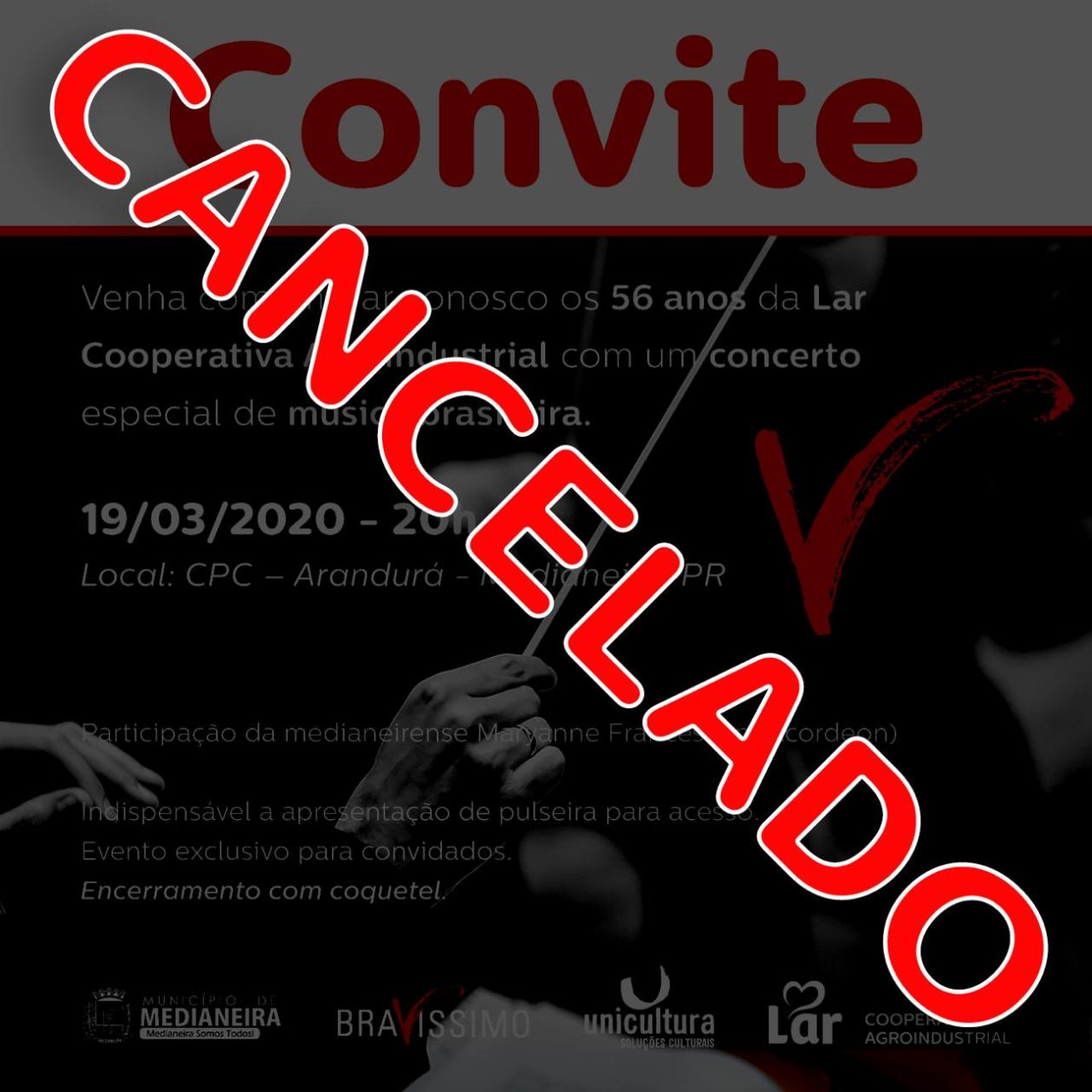 56 ANOS DA LAR – Como medida de prevenção e seguindo as recomendações do Ministério da Saúde de evitar aglomerações de pessoas, o evento BRAVÍSSIMO – Concerto musical alusivo aos 56 anos da Lar Cooperativa Agroindustrial, que estava previsto para o dia 19/03 foi cancelado.