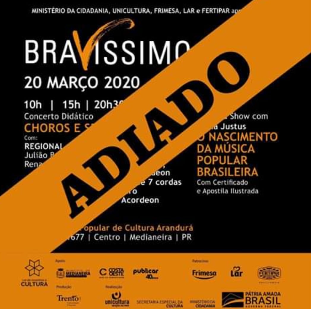 BRAVÍSSIMO – Devido ao aumento de casos do novo Coronavírus no Brasil, a Unicultura em conjunto com as empresas patrocinadoras do projeto e com a Prefeitura de Medianeira por meio do seu Departamento de Cultura, optou por ADIAR as atividades do Bravíssimo que aconteceriam dia 20/03/2020 no CPC Arandurá, em Medianeira. Serão acompanhados os desdobramentos dessa pandemia e assim que possível a data do concerto e da palestra-show serão remarcados.