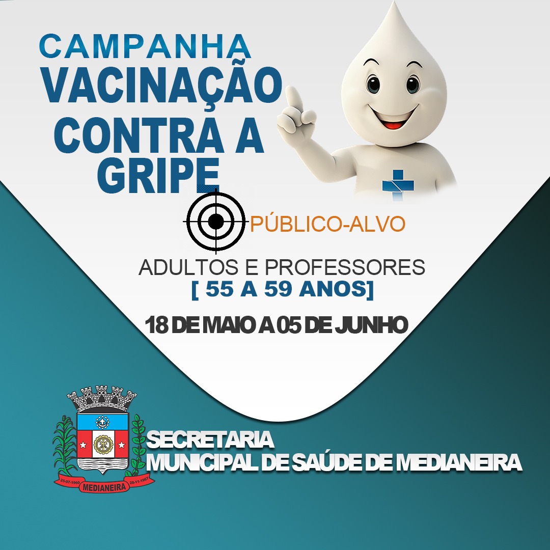 Iniciou nesta segunda-feira (18) e segue até 05 junho a segunda fase da terceira etapa de vacinação da Campanha Nacional de Vacinação contra a Influenza, e contempla adultos de 55 a 59 anos e professores.