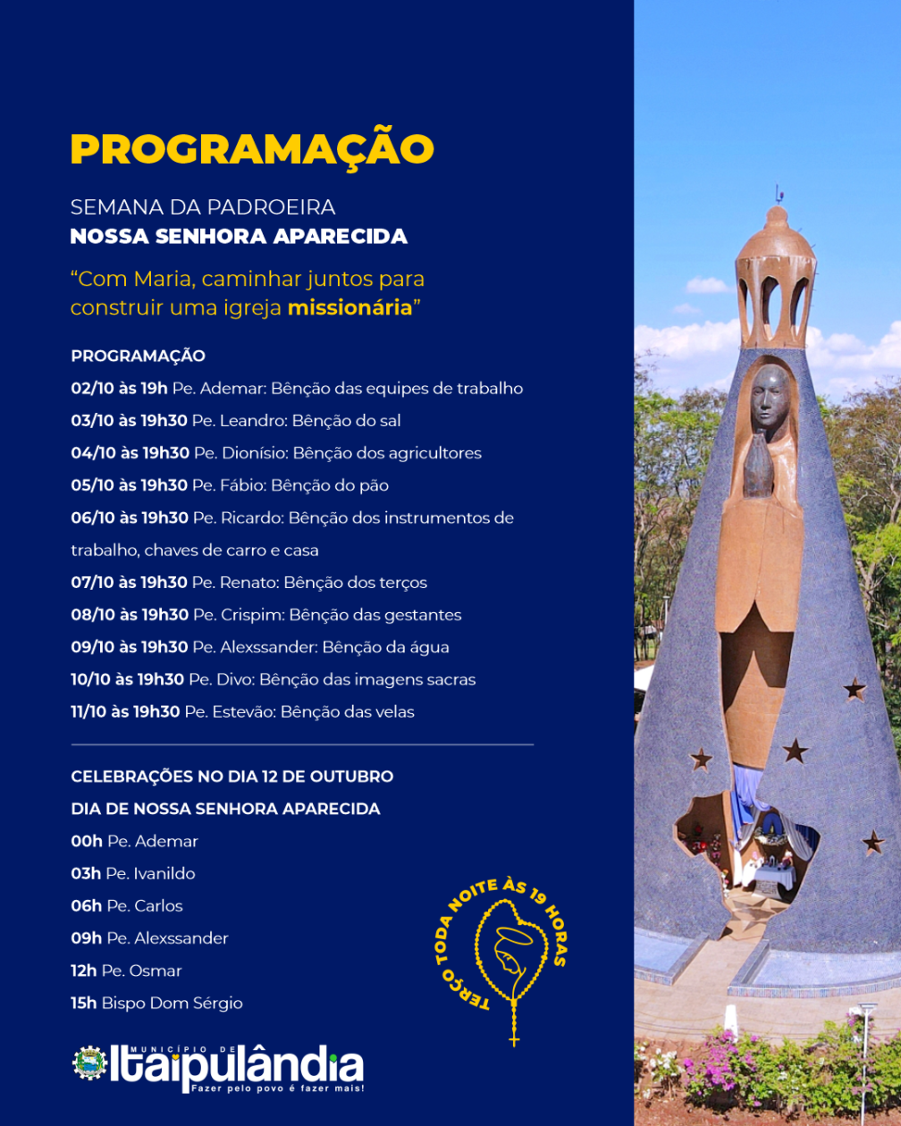 Programação de celebrações na Semana da Padroeira Nossa Senhora Aparecida. Lema: “Com Maria, caminhar juntos para construir uma igreja missionária”
