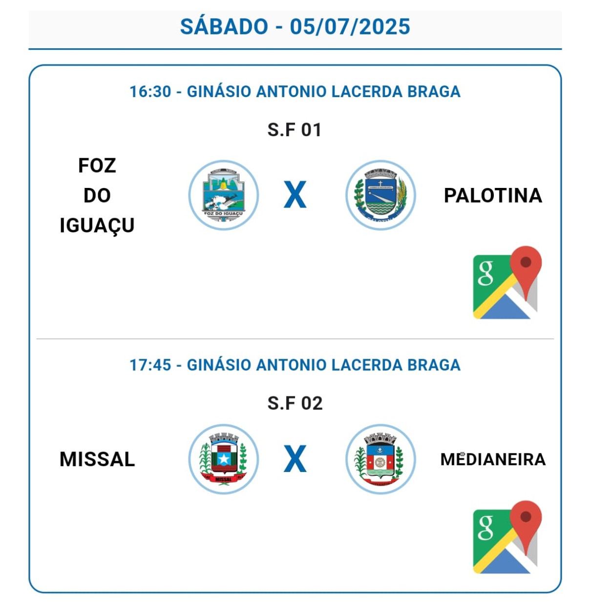 A partir das 16h30 Foz do Iguaçu e Palotina se enfrentam, valendo vaga para a decisão no domingo, dia 06.