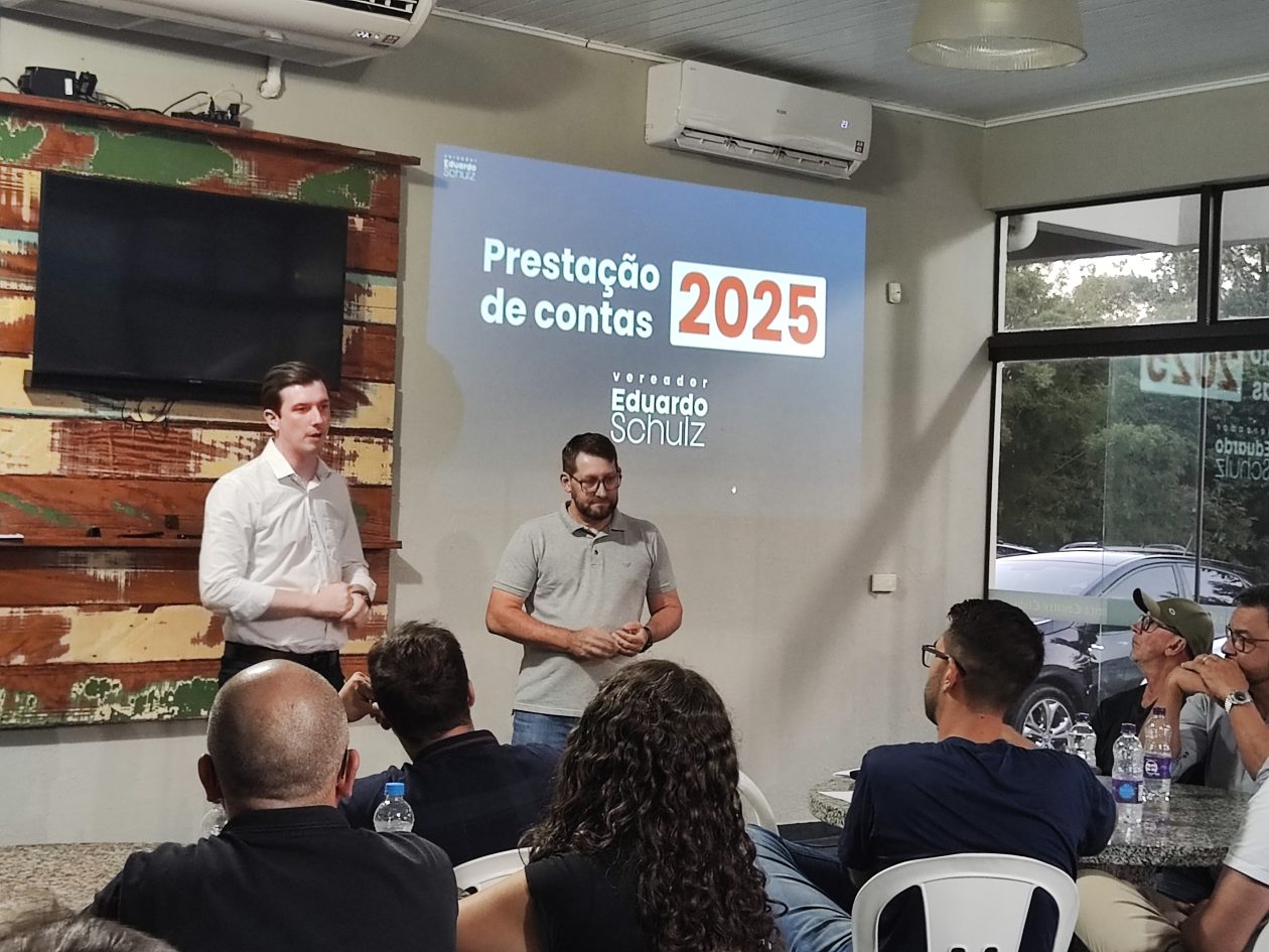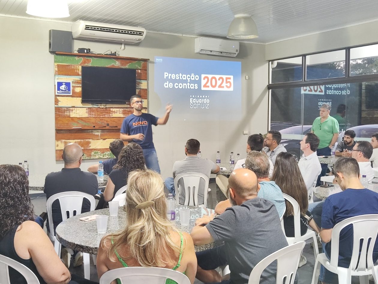 O vereador de Medianeira, Eduardo Schulz, reuniu, na última quinta-feira (22), lideranças políticas do Partido NOVO e convidados para uma noite de prestação de contas do seu primeiro ano de mandato na Câmara Municipal. “A primeira coisa que me vem à cabeça nesse balanço de primeiro ano de trabalho é aprendizado. Porque quando estamos fora da política, imaginamos uma coisa e quando entramos, percebemos que é completamente diferente. É muito mais desafiador. Eu tinha que saber sobre saúde, segurança, educação e em níveis muito mais profundos do que eu imaginava. Aos poucos fui entendendo como funciona, que nem tudo é no tempo que você quer. Enfim, foi um balanço muito positivo. Inclusive já identifiquei algumas coisas que dá para melhorar e coloquei no meu planejamento estratégico para 2026, que já estou implementando”, conta Eduardo.