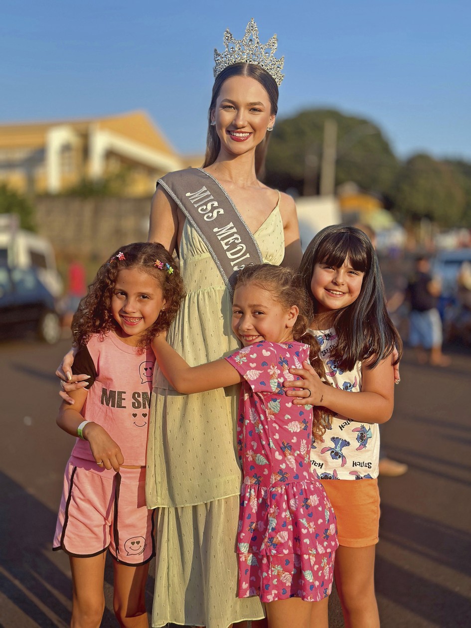Outro sonho que Bruna acalenta desde menina é ser Miss, este já realizado no último dia 20 de julho, quando conquistou o título de Miss Medianeira 2024. “Desde 2019 venho me preparando para ser Miss, comecei a malhar, cuidar do meu corpo e do meu psicológico, para que eu conseguisse exercer o cargo com excelência e sabedoria, pretendo ir muito além, trazendo a coroa de Miss Paraná para Medianeira”, comenta.