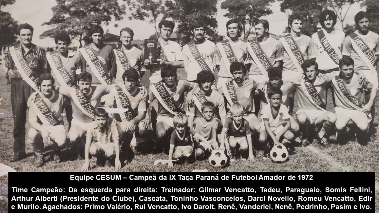 EQUIPE CESUM – O presidente do Clube na época da conquista da IX Taça Paraná de futebol amador era Arthur Alberti, o treinador Gilmar Vencatto, e os jogadores: Tadeu, Paraguaio, Somis, Cascata, Toninho Vasconcelos, Darci Novelo, Romeu Vencatto, Edir, Murilo, Primo Valério, Rui Vencatto, Ivo Darolt, Renê, Vanderlei, Nenê, Pedrinho, Pasim e Ivo.