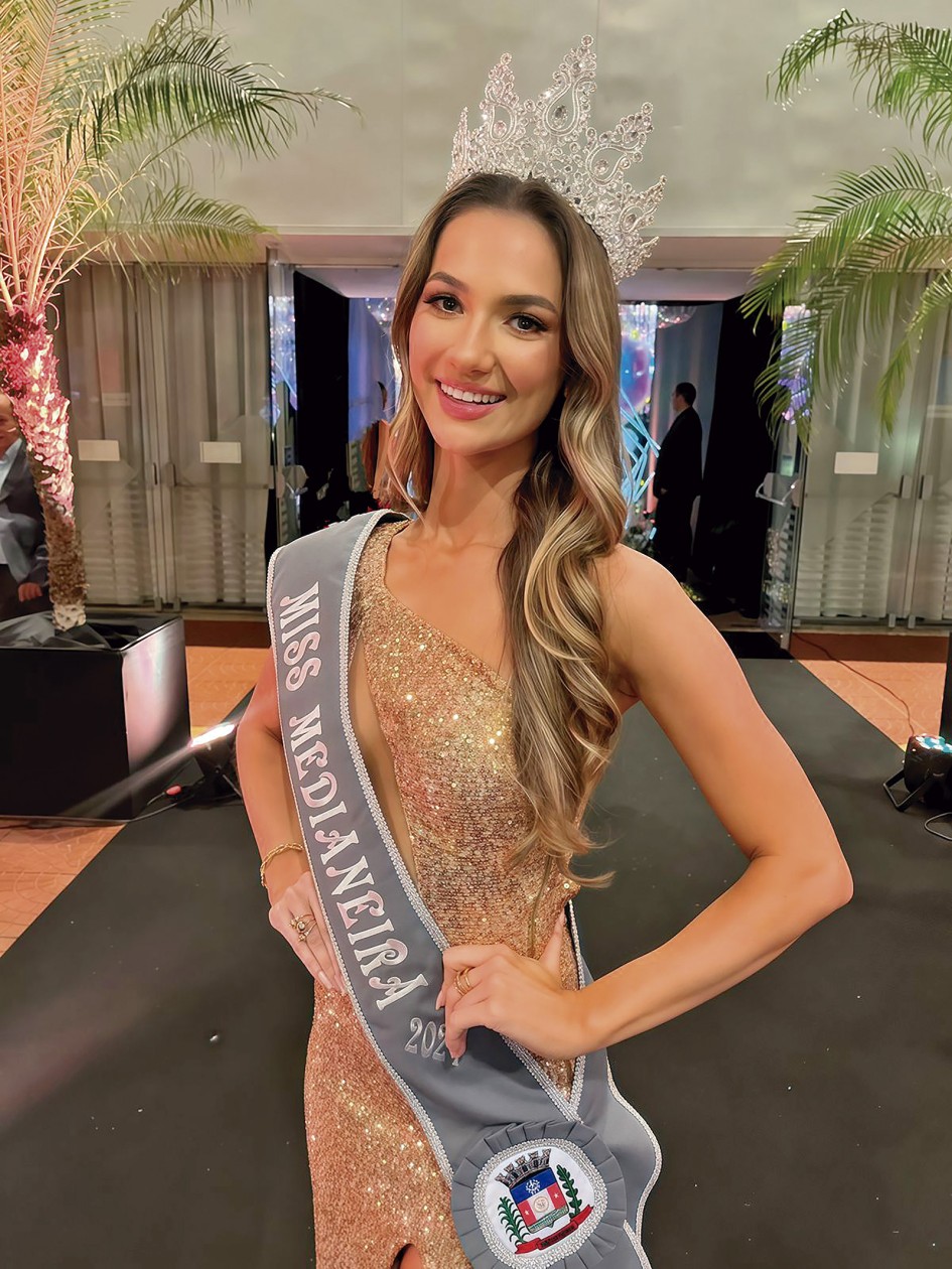 Outro sonho que Bruna acalenta desde menina é ser Miss, este já realizado no último dia 20 de julho, quando conquistou o título de Miss Medianeira 2024. “Desde 2019 venho me preparando para ser Miss, comecei a malhar, cuidar do meu corpo e do meu psicológico, para que eu conseguisse exercer o cargo com excelência e sabedoria, pretendo ir muito além, trazendo a coroa de Miss Paraná para Medianeira”, comenta.